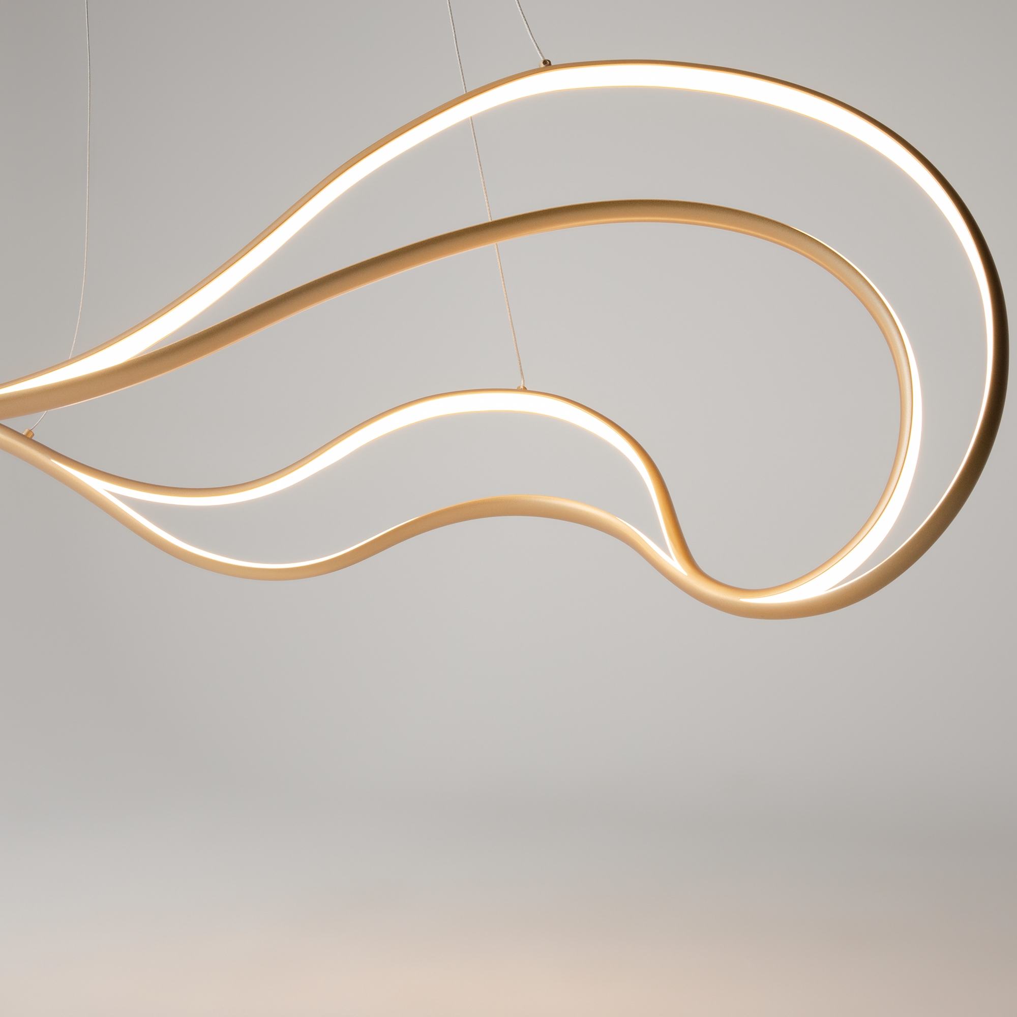 Материал арматуры — алюминий, цвет латунь. Силиконовый рассеиватель. LED-источник света, цветовая температура 3000К. Регулируемый провод у подвесных моделей — 3 метра.