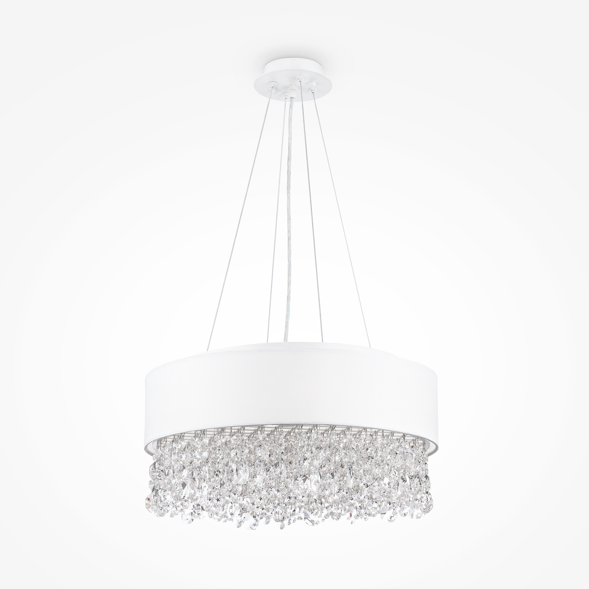 Металлическая арматура в белом цвете. Абажур – ткань, нанесенная на ПВХ, цвет – белый. Декор – подвески в виде граненых кристаллов. Высота подвесных светильников регулируется тросом.