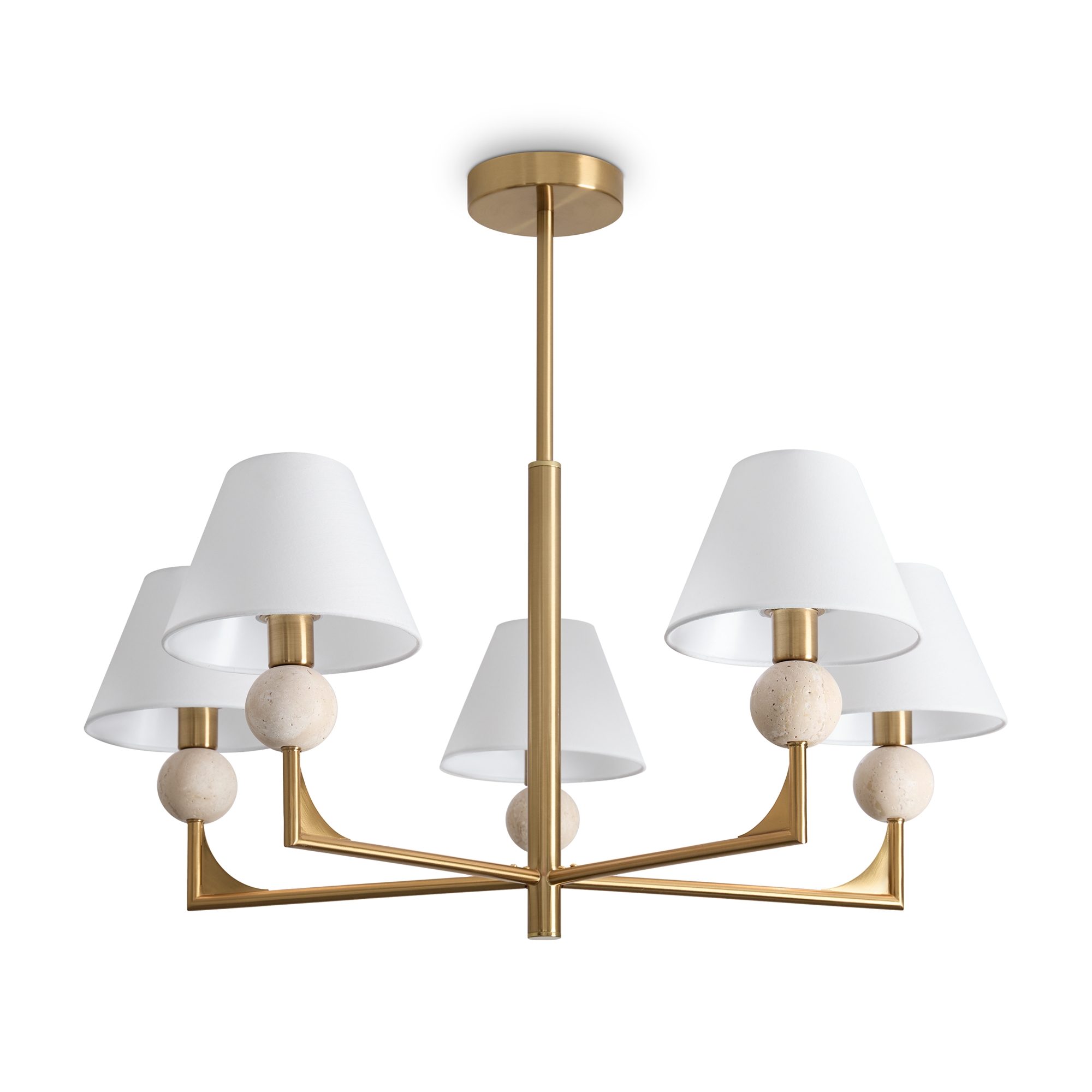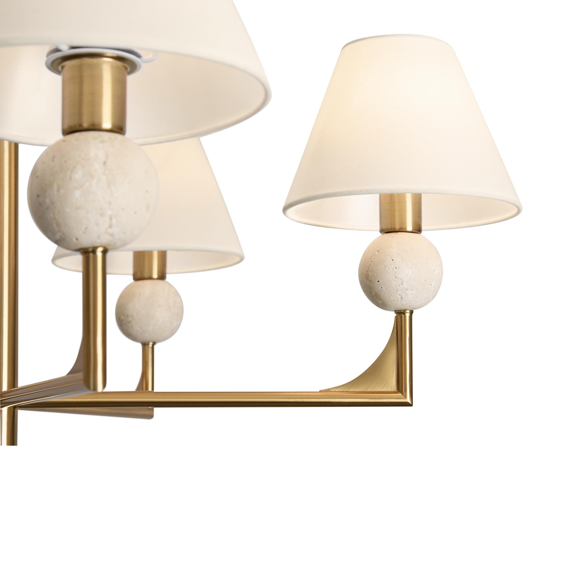 Материал арматуры — металл. Цвет металла — латунь. Абажуры выполнены из белой ткани, которые мягко рассеивают свет. Потолочные и настенные светильники с цоколем E14. Декоративные элементы в форме шара на плафоне выполнены из травертина. Металлическая форма арматуры строгой геометрической формы с пластинами из латуни. Подходит для оформления элегантных классических пространств.