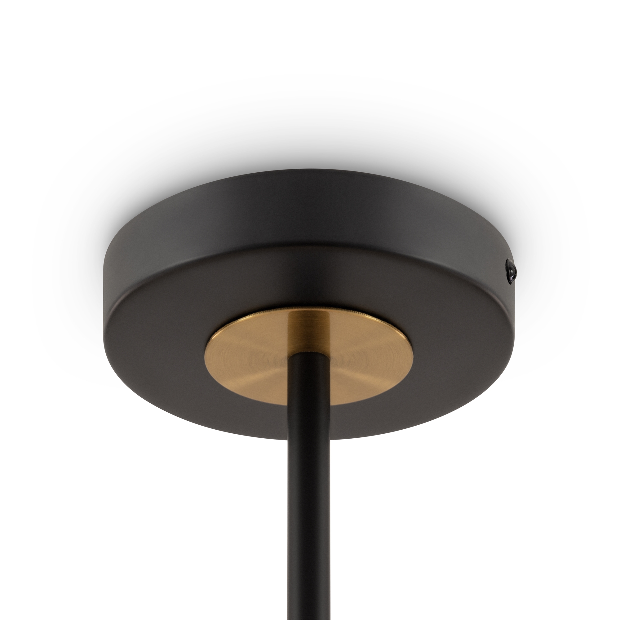 Арматура — металл, цвет — чёрный. Декоративные крепления и вставки цвета латуни. Тканевые абажуры в форме конуса из микса теплых цветов: бежевый и коричневый. Открытые верхние основания абажуров пропускают дополнительный свет. Динамичный дизайн в стиле Casual. Источник света — лампа с цоколем Е14.