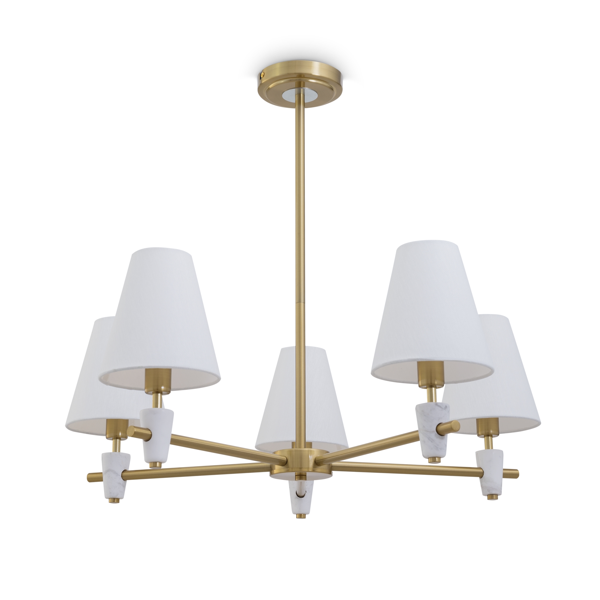 Металлическая арматура в цвете латунь. Дополнительные элементы — минималистичные вставки из натурального белого мрамора. Белые абажуры из ткани в форме конуса. Источник света — лампа с цоколем Е14 или Е27.