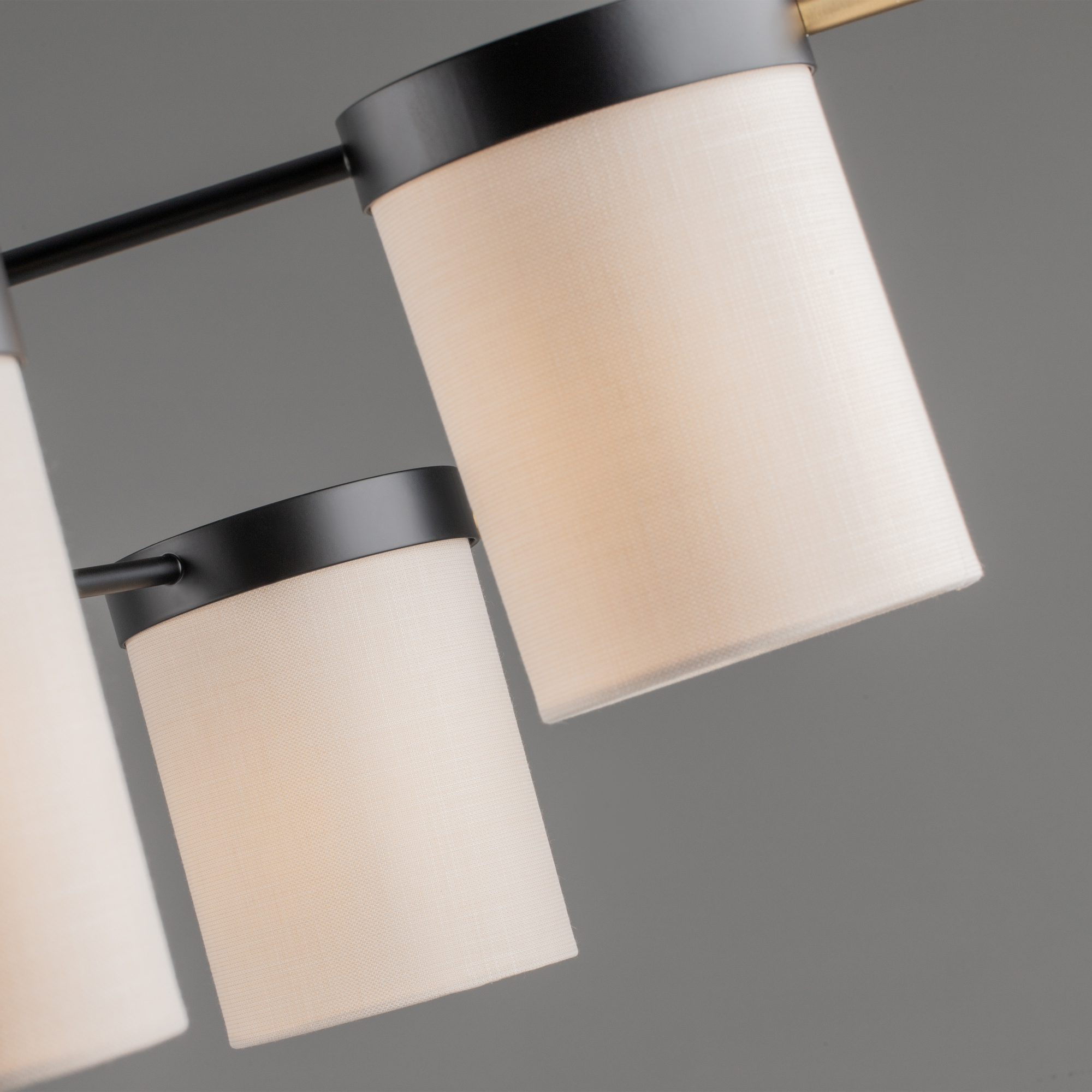 Арматура из металла. Основной цвет — чёрный, декоративные элементы в цвете латунь. Тканевые бежевые абажуры-цилиндры украшены чёрными металлическими основаниями. Компактные размеры для невысоких потолков. Источник света — лампа с цоколем Е14.