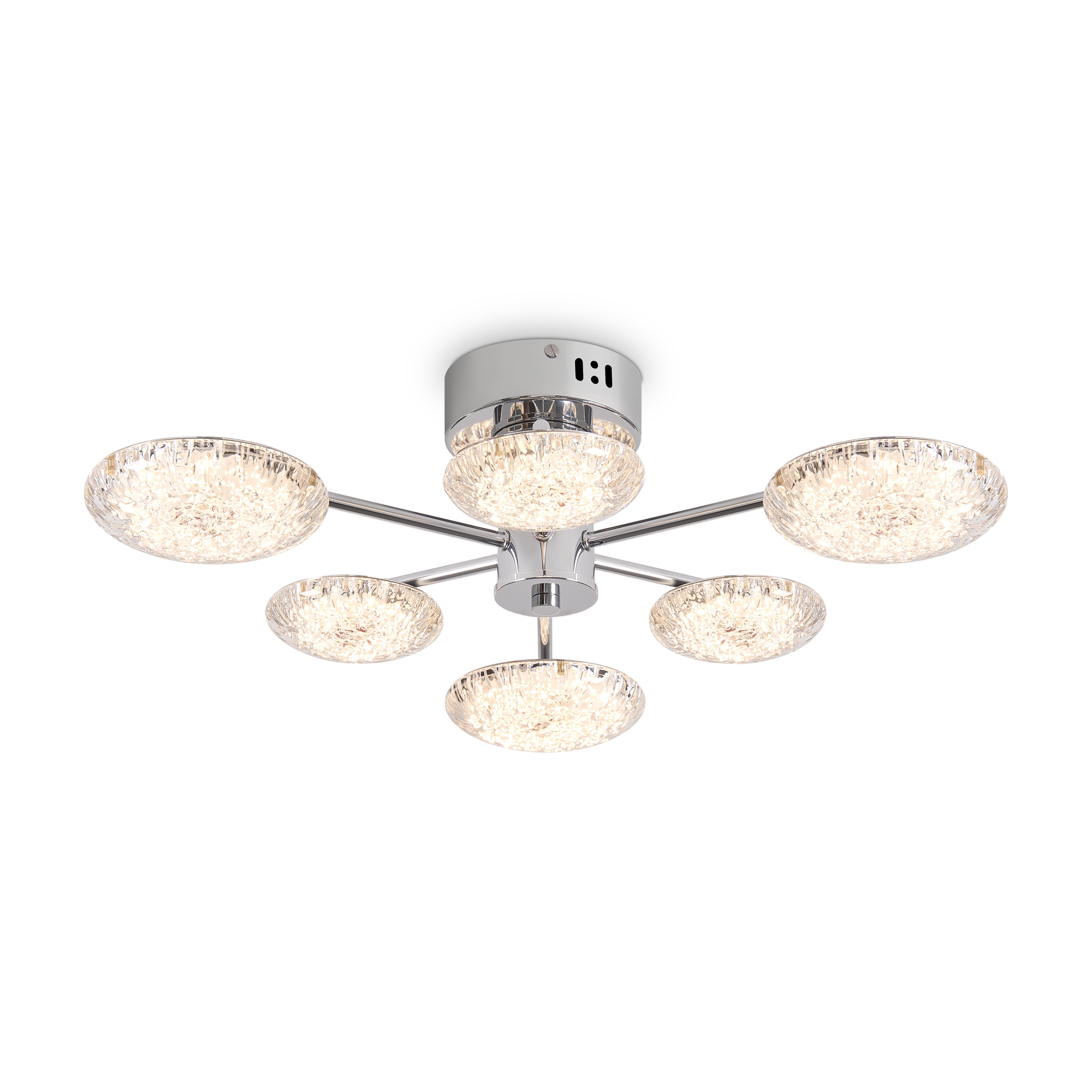 Материал арматуры — металл, цвет — хром. Потолочный светильник оснащен LED-источником света с цветовой температурой 2700К. Плафоны с рисунком из воздушных пузырьков акрила полусферической формы. Футуристичный дизайн идеа…