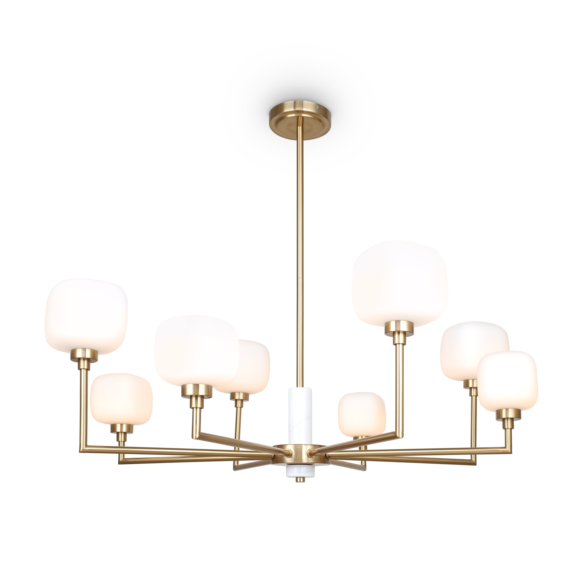 Металлическая графичная арматура цвета латунь. Плафоны из белого матового стекла в необычной форме округлых кубов — закреплены на разной по высоте комбинации. Мягкое равномерное освещение. Источником света служит лампа с цоколем G9.