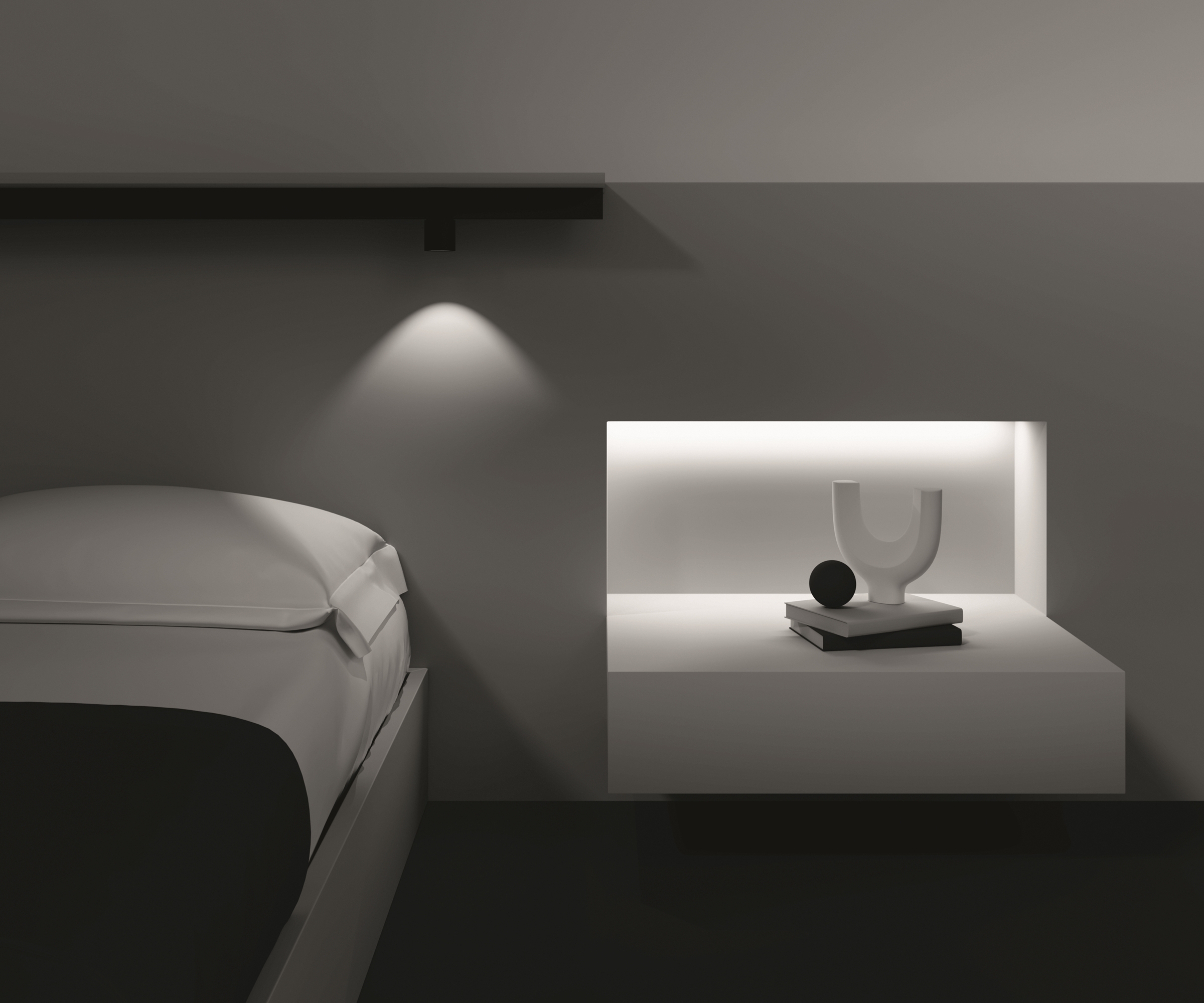 Алюминиевый корпус. Цвета — белый, черный и латунь с черным коннектором для установки в магнитный шинопровод Exility. LED-источник света. Два варианта цветовой температуры — 3000К и 4000К, а также умные светильники с регулировкой цветовой температуры от 3000 K до 6000 K и диммированием по протоколу Bluetooth Mesh. Источник света утоплен вглубь плафона для комфорта зрения. Корпус модели — форма вытянутого куба и цилиндра.
