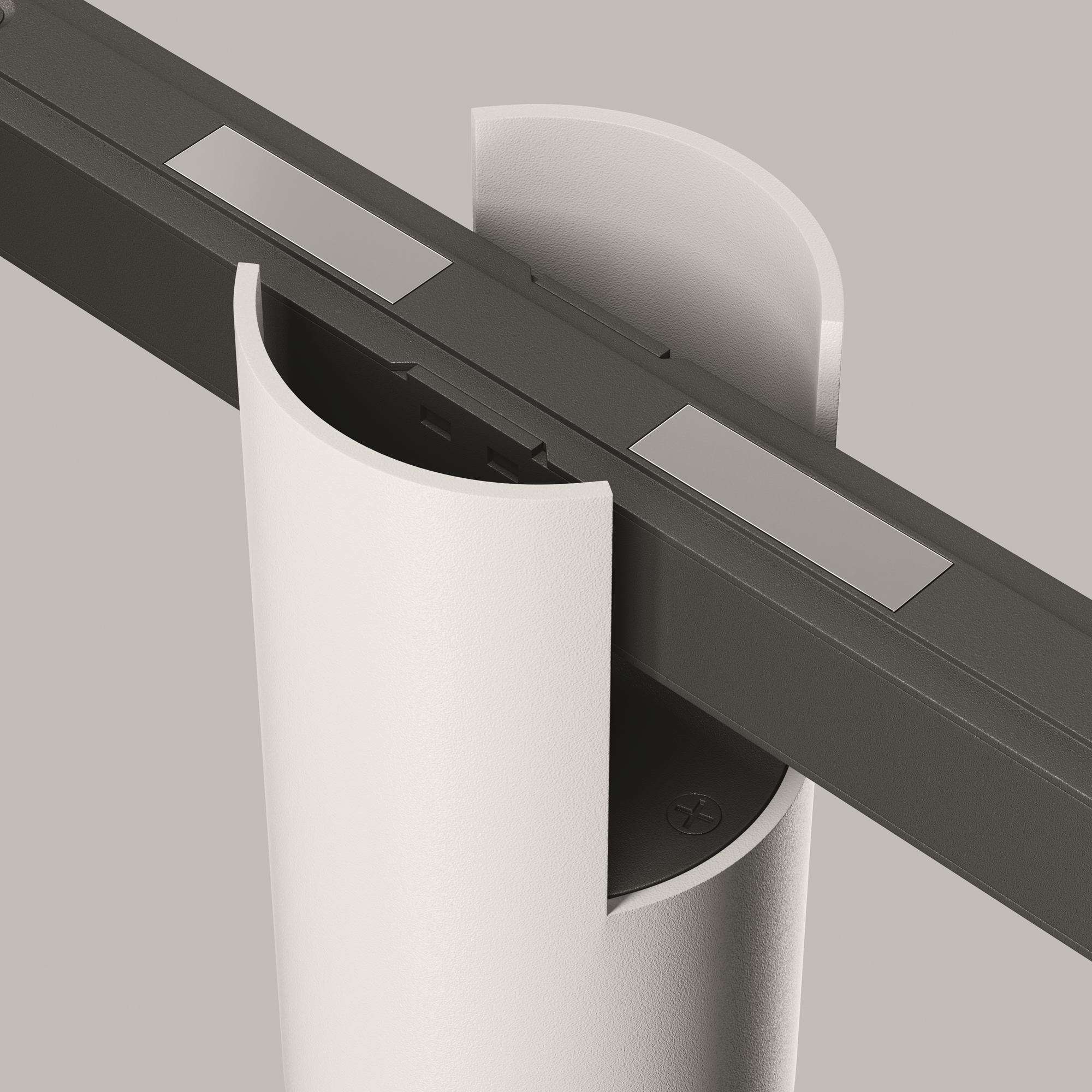 Алюминиевый корпус. Цвета — белый, черный и латунь с черным коннектором для установки в магнитный шинопровод Exility. LED-источник света. Два варианта цветовой температуры — 3000К и 4000К, а также умные светильники с регулировкой цветовой температуры от 3000 K до 6000 K и диммированием по протоколу Bluetooth Mesh. Источник света утоплен вглубь плафона для комфорта зрения. Корпус модели — форма вытянутого куба и цилиндра.