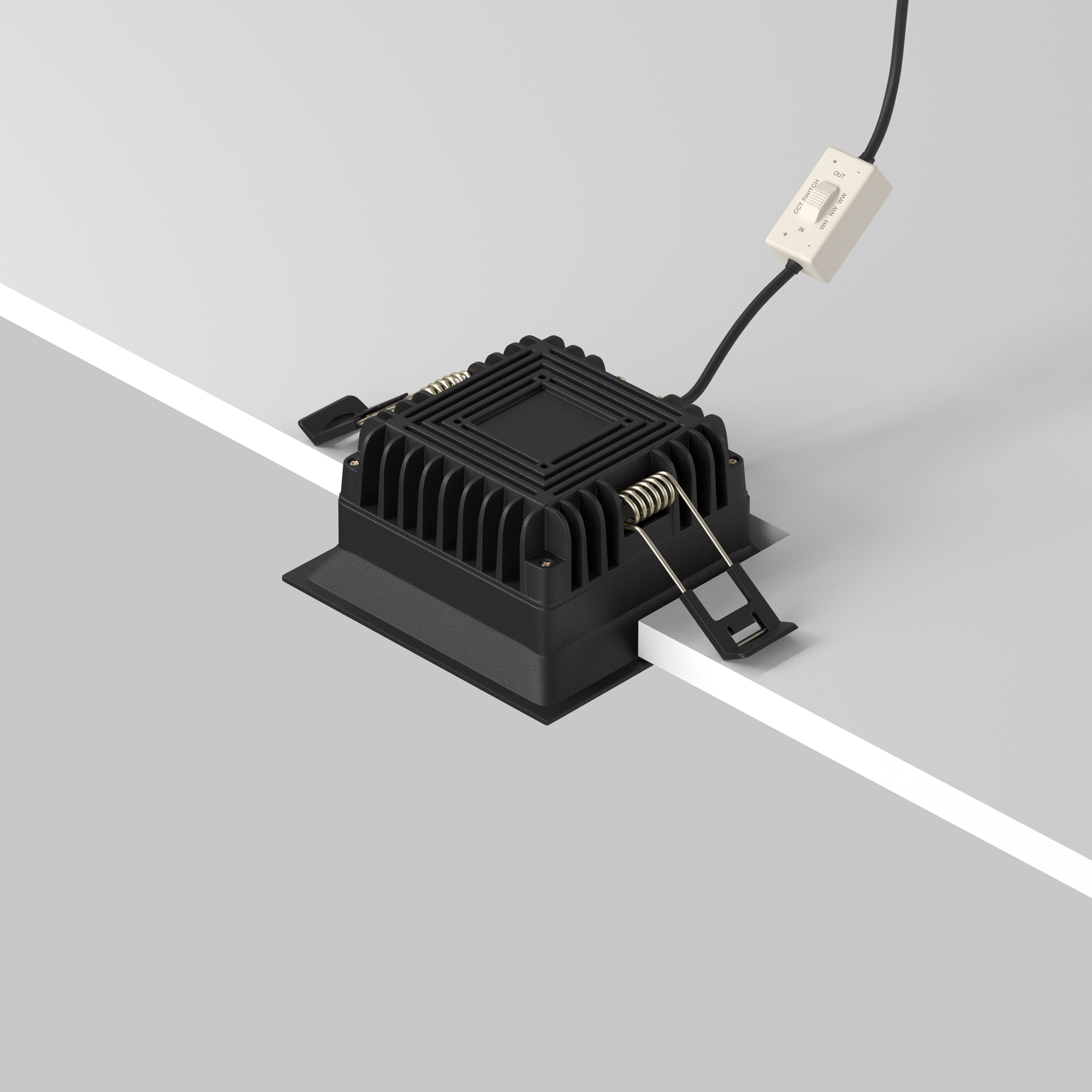 Материал арматуры — алюминий и пластик. Организация основного освещения в интерьере. Высокий коэффициент цветопередачи >90. Качественное отображение цветов. Утопленный матовый рассеиватель. Переключатель цветовой температуры. Повышенная степень пылевлагозащиты IP 44.